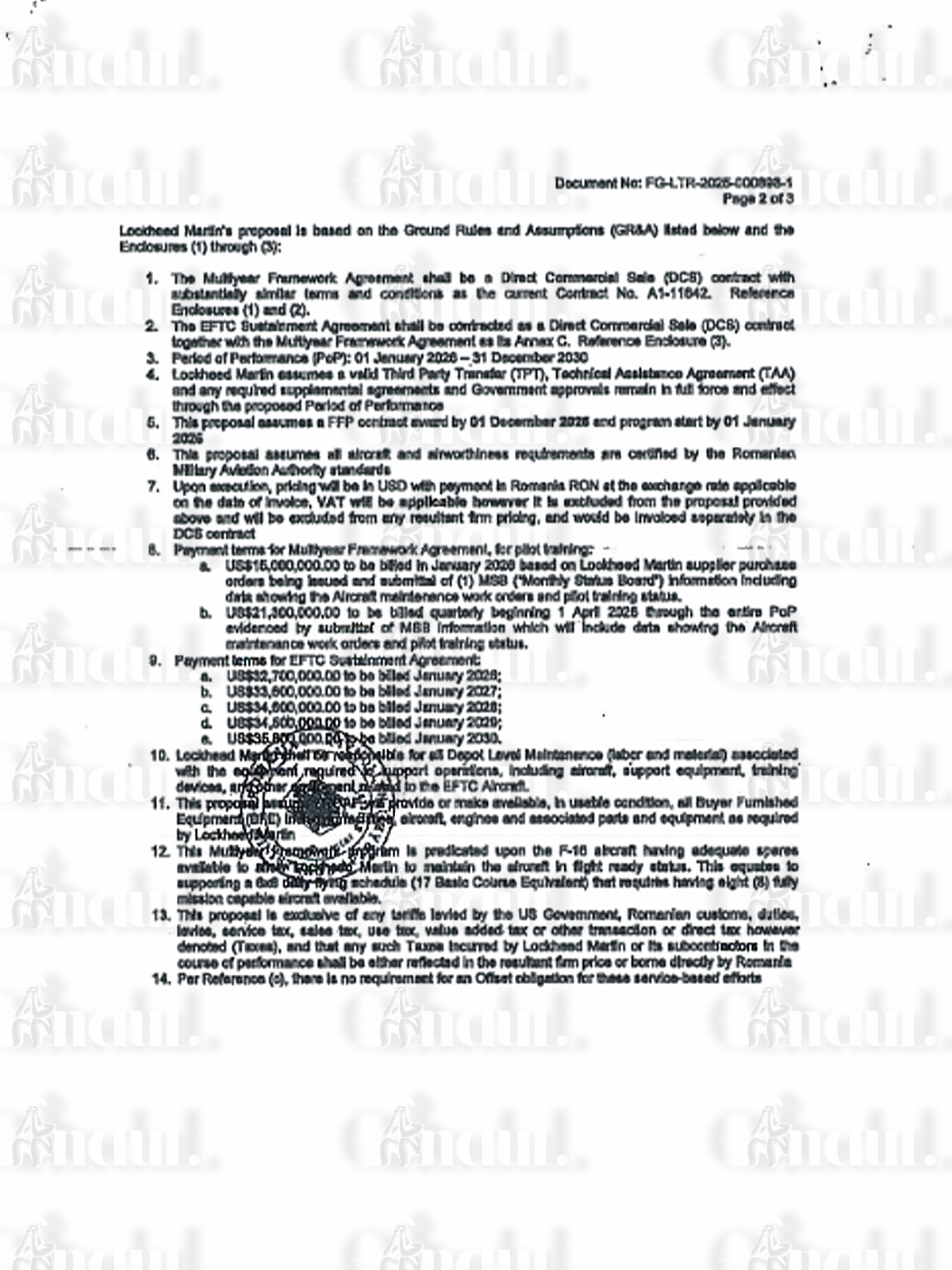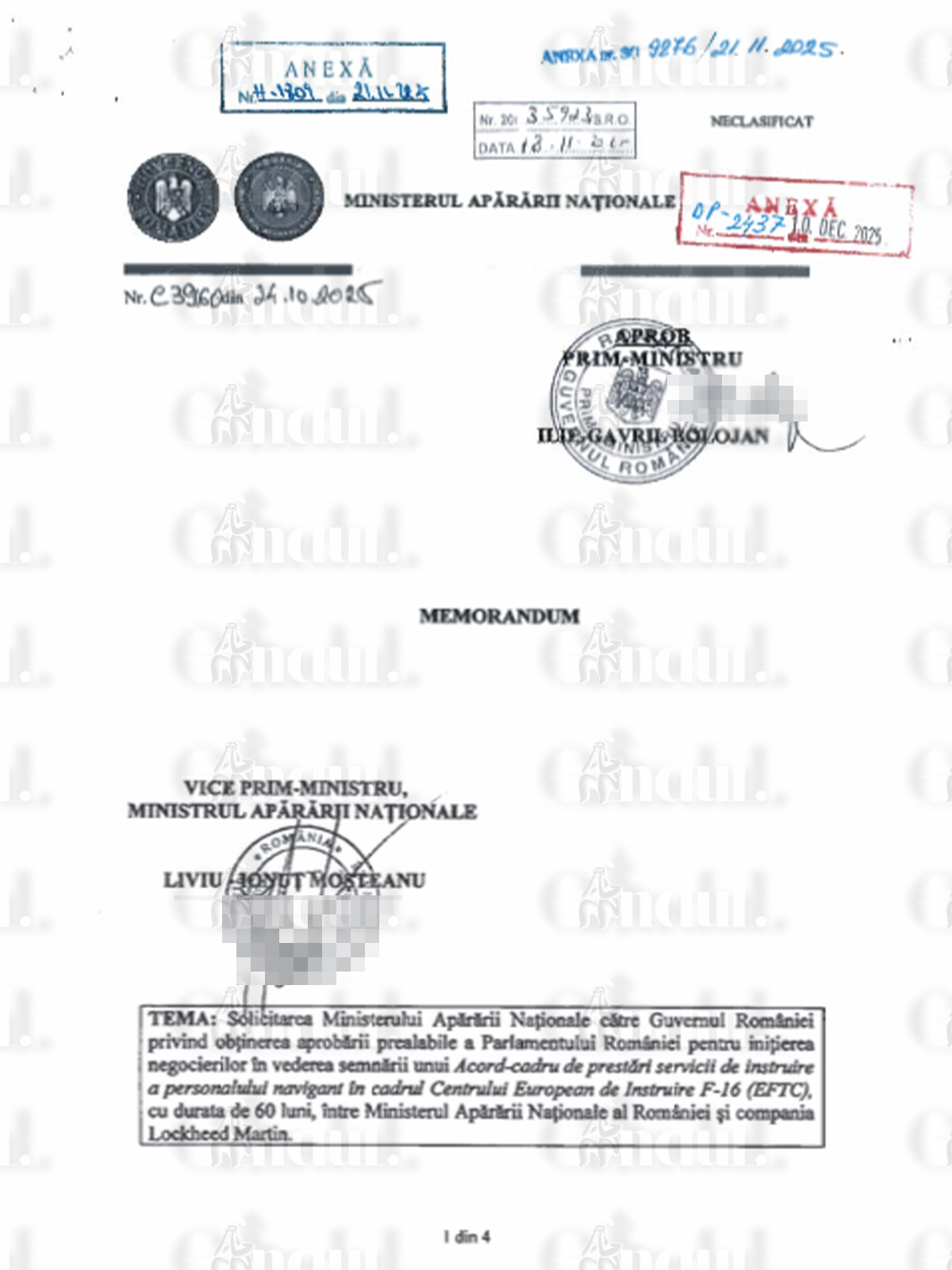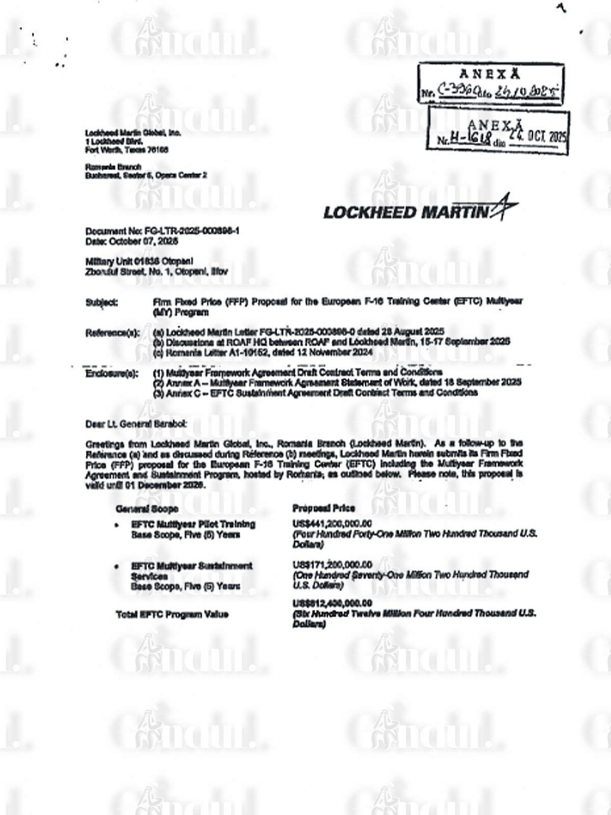 Comisiile parlamentare de apărare au examinat și aprobat solicitarea Ministerului Apărării Naționale pentru negocierea unui acord-cadru cu compania Lockheed Martin, în valoare estimată de 612,4 milioane de dolari, fără TVA. Acordul, pentru o durată de 60 de luni, vizează funcționarea Centrului European de Instruire F-16 (EFTC) și include servicii de instruire a piloților, mentenanță pentru aeronavele F-16 și suport logistic integrat.