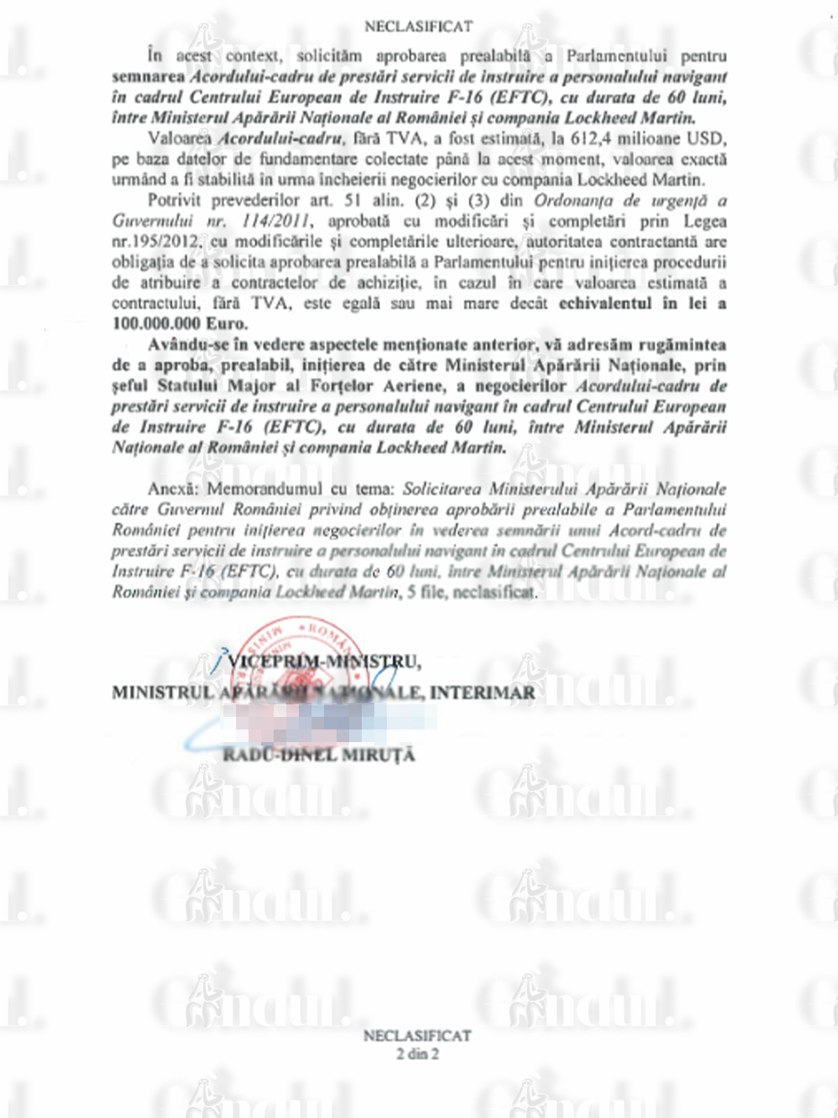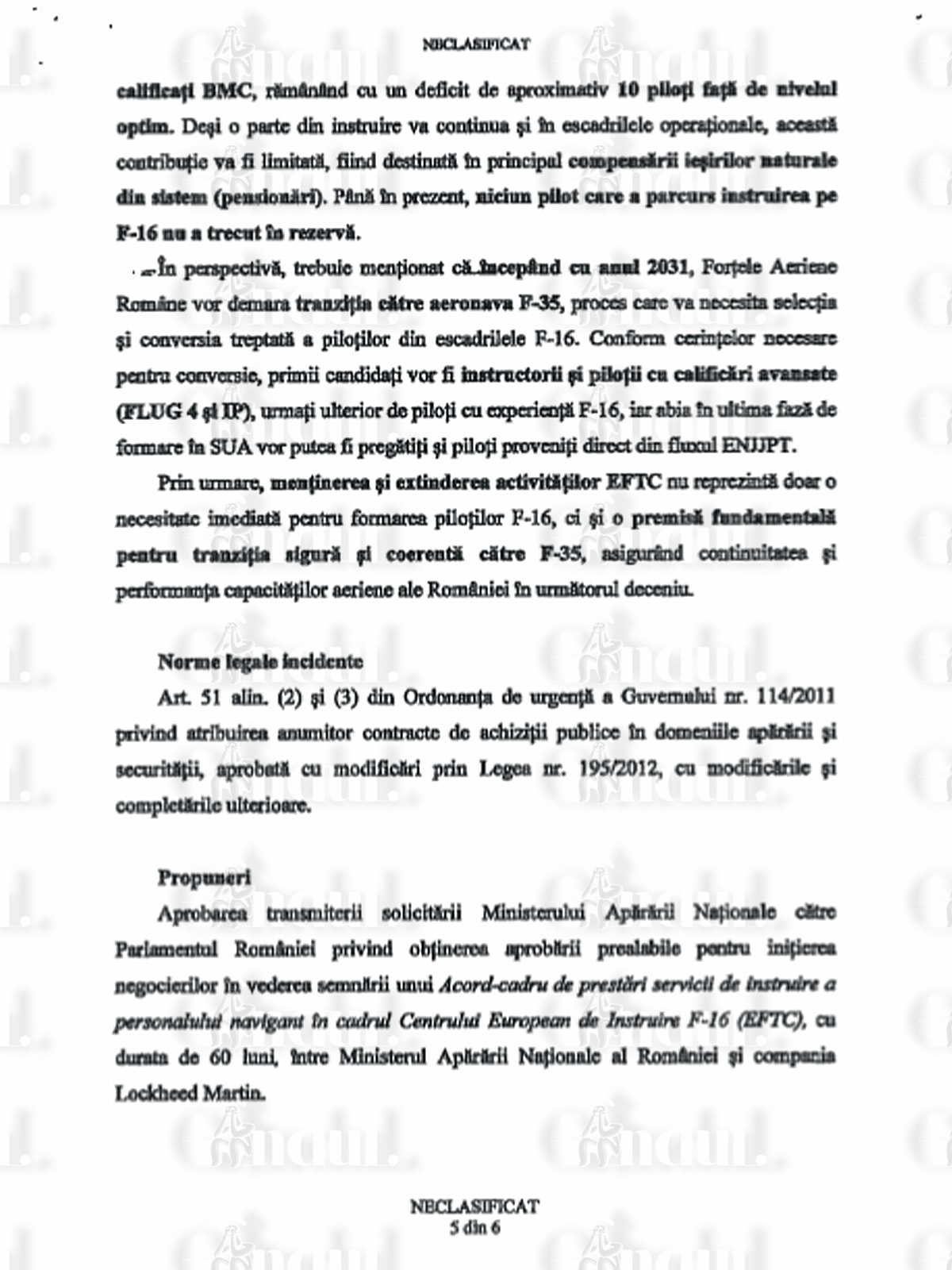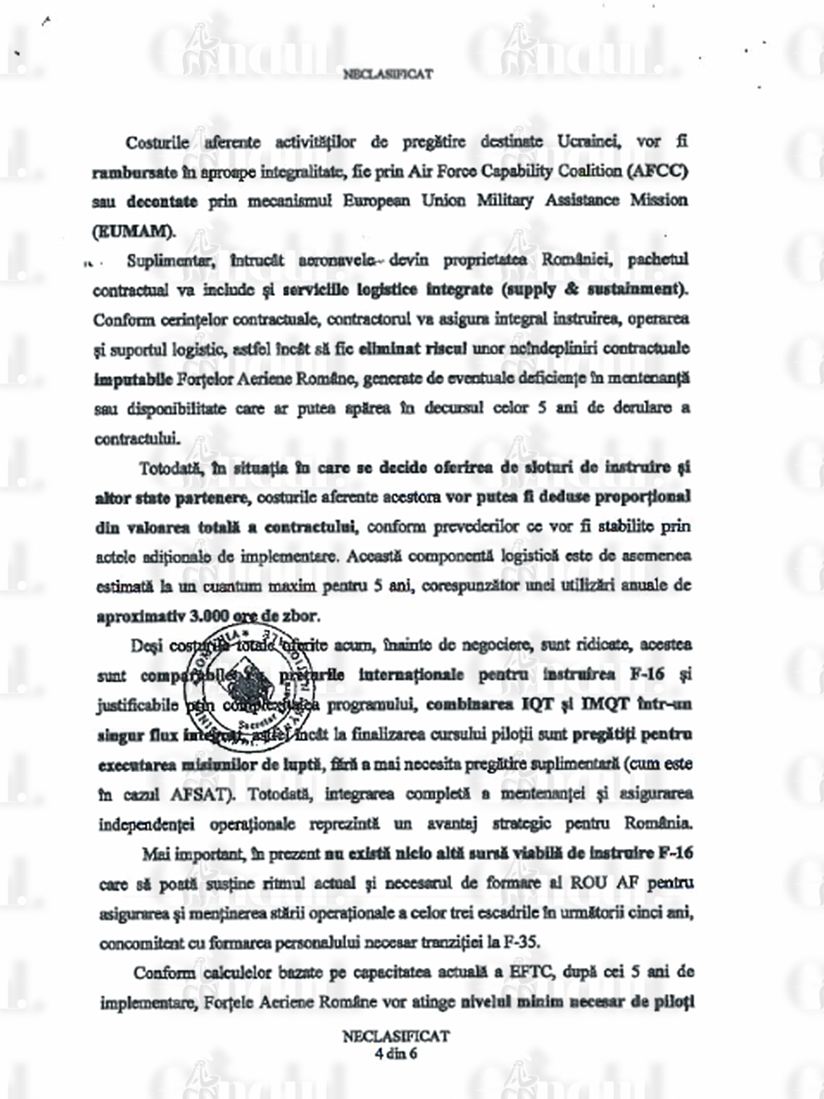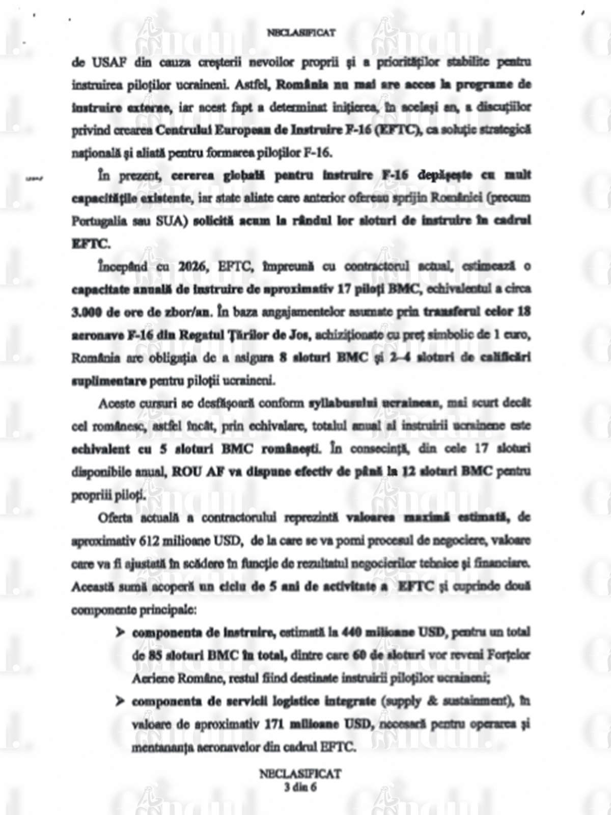 „Începând cu 1 ianuarie 2026, odată cu transferul celor 18 avioane F-16, responsabilitatea pentru funcționarea, administrarea și operarea Centrului European de Instruire F-16 va reveni României. Pentru continuarea instruirii piloților F-16 pe teritoriul național, în cadrul EFTC, s-a considerat soluția încheierii unui acord-cadru cu Lockheed Martin”, se arată în solicitarea MApN.