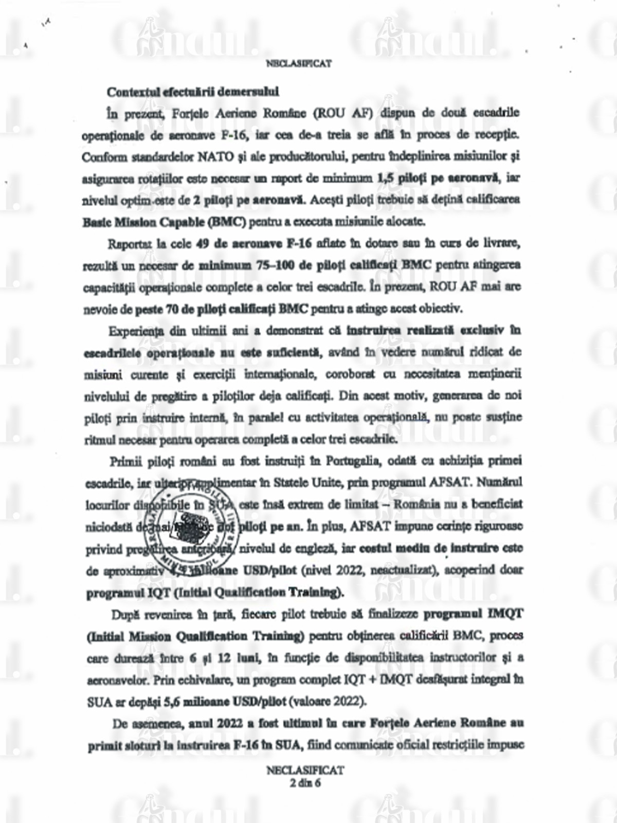 Parlamentul României a aprobat marți un acord de peste 600 de milioane de dolari pentru pregătirea piloților români și ucraineni pe avioane F-16. Acordul-cadru pentru servicii de instruire a personalului va fi semnat cu compania Lockheed Martin și are o durată de 60 de luni. Vor fi instruiți 60 de piloți români și 25 de piloți ucraineni. Pentru piloții ucraineni, costurile de instruire vor fi rambursate prin mecanisme europene și transatlantice. Valoarea estimată a acestui acord-cadru este de 612,4 milioane de dolari, fără TVA. Gândul a obținut în exclusivitate documentele.