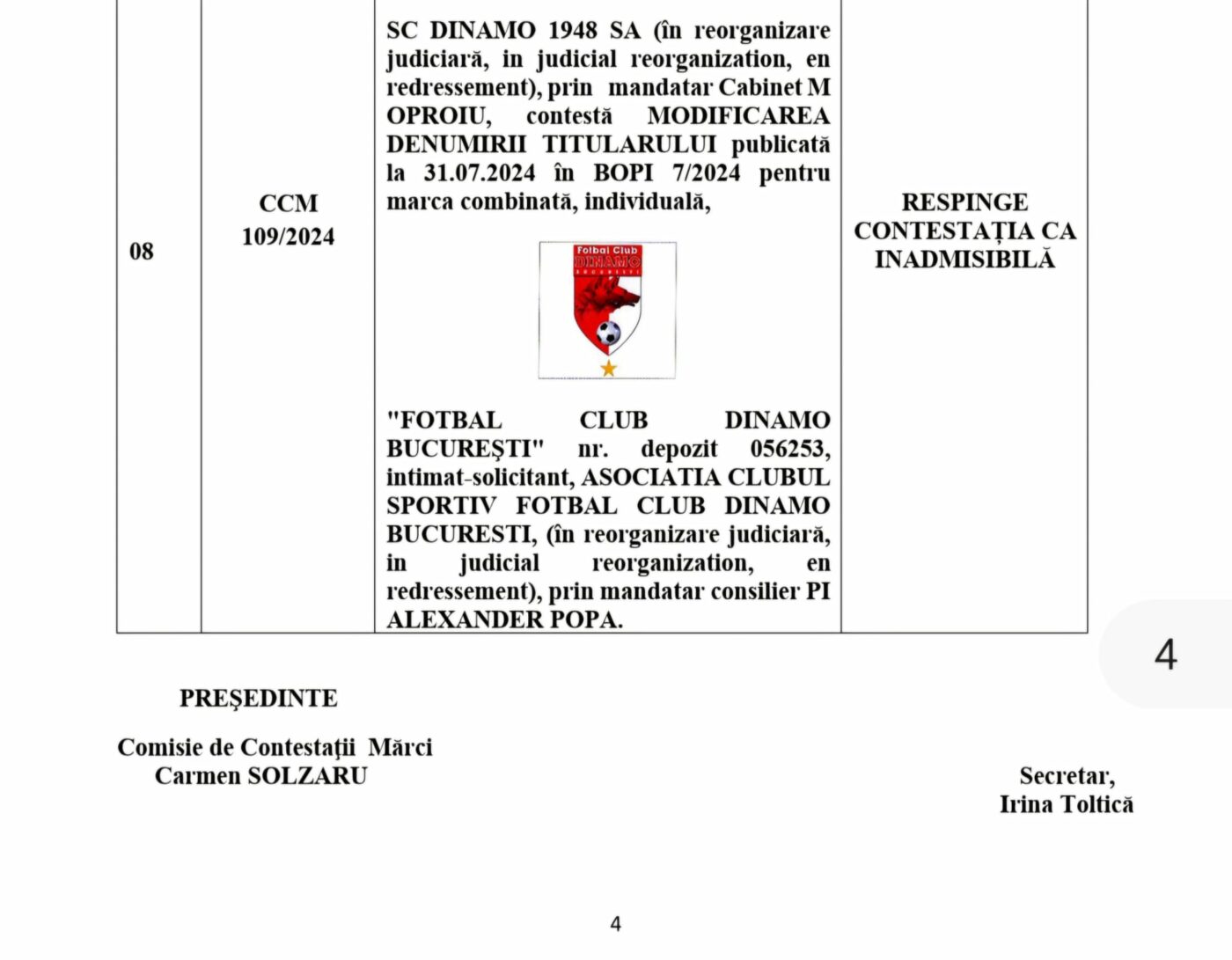Chiar și după aceste încercări, conducerea clubului nu a renunțat și a continuat demersurile, însă fără succes, iar în această lună, la data de 14.10.2024, Comisia de contestații a OSIM a suspendat procedura de reevaluare a cererilor SC Dinamo referitoare la mărcile contestate, decizie luată față de hotărârile din 24.07.2024 ale OSIM de respingere a înregistrării acestor semne.