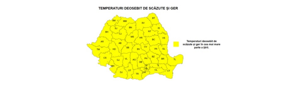 Marți, între orele 10:00 și 20:00, se menține codul galben de ger în județele Botoșani, Iași, Harghita, Mureș, Cluj, Alba și Hunedoara.