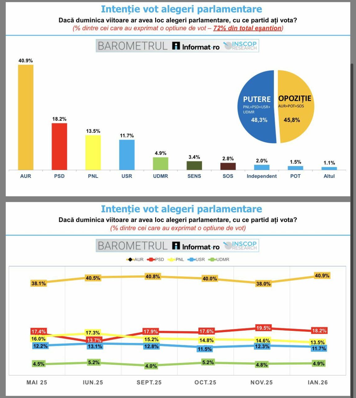 INSCOP a publicat cel mai recent rezultat al sondajului de opinie, realizat în perioada 12-15 ianuarie 2026, pe un eșantion de 1.100 de persoane, cu un nivel de încredere de 95%. Conform studiului, dacă duminica viitoare ar avea loc alegeri parlamentare, 40,9% dintre alegători ar vota pentru AUR, 18,2% pentru PSD, 13,5% pentru PNL și 11,7% pentru USR, conform celui mai recent sondaj INSCOP Research, publicat miercuri.