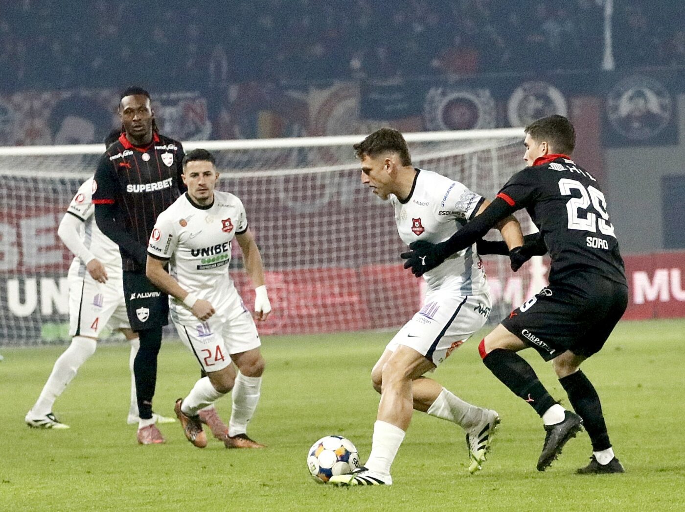Constantin Dragos Albu, Antoni Valeri Ivanov și Alberto Soro Alvarez, Mamoudou Karamoko în meciul de fotbal dintre AFC Hermannstadt Sibiu și Dinamo București, parte a Superligii Superbet, jucat pe Stadionul Municipal din Sibiu, vineri 23 ianuarie 2026. © FOTO: Valentin Macrea/SPORT PICTURES