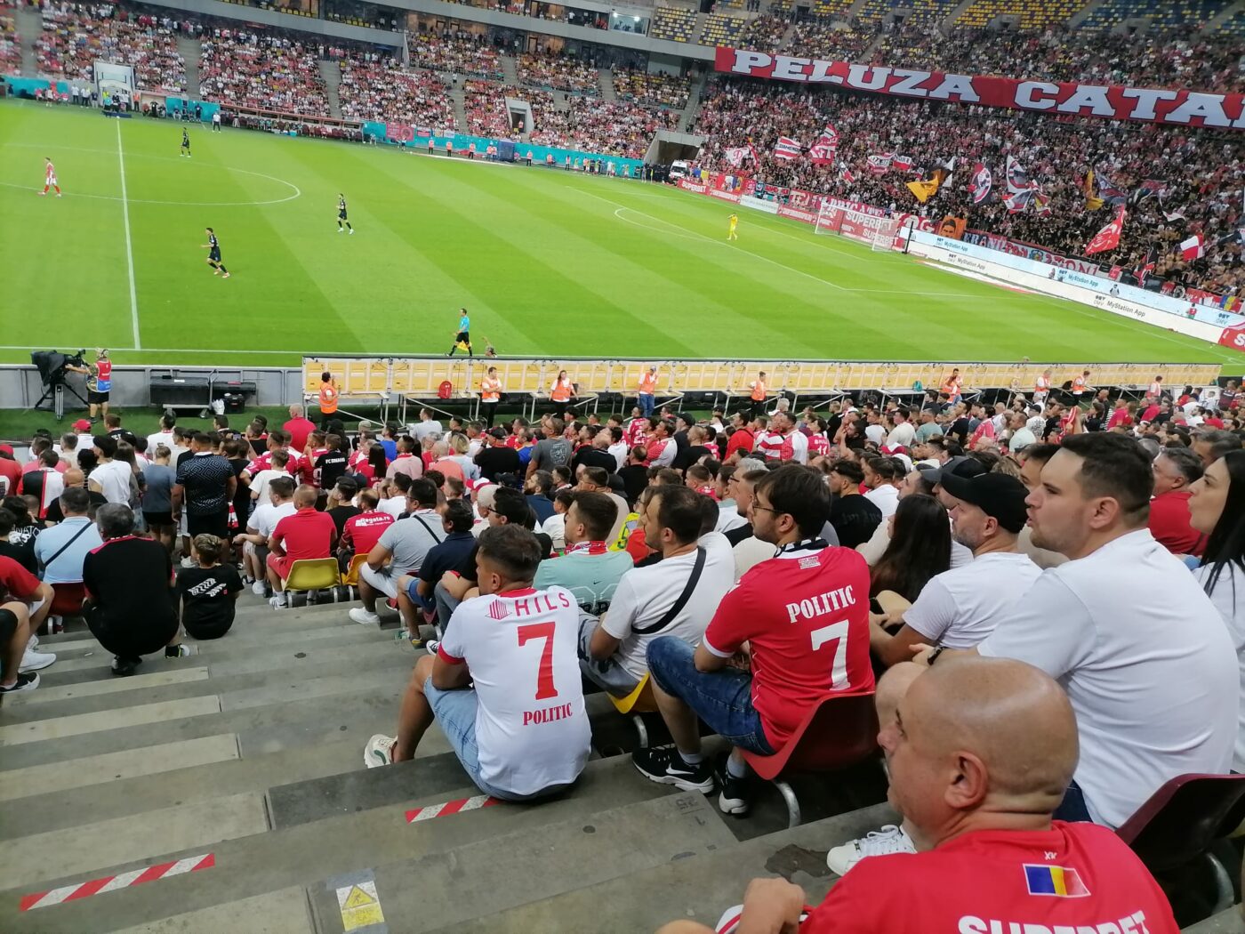 În meciul de duminică seara, în tribunele Arenei Naționale s-au aflat suporțeri dinamoviști care purtau tricouri roș-albe cu numele și numărul lui Dennis Politic.