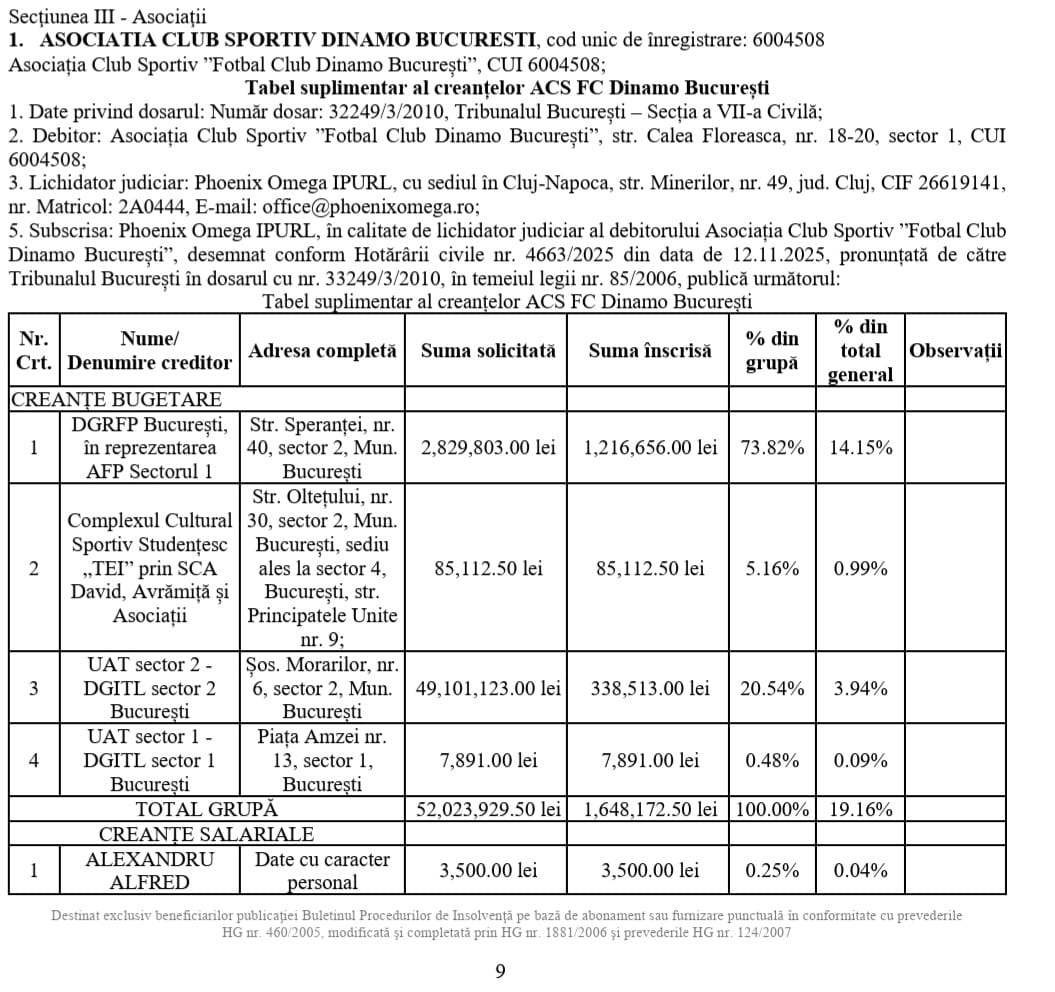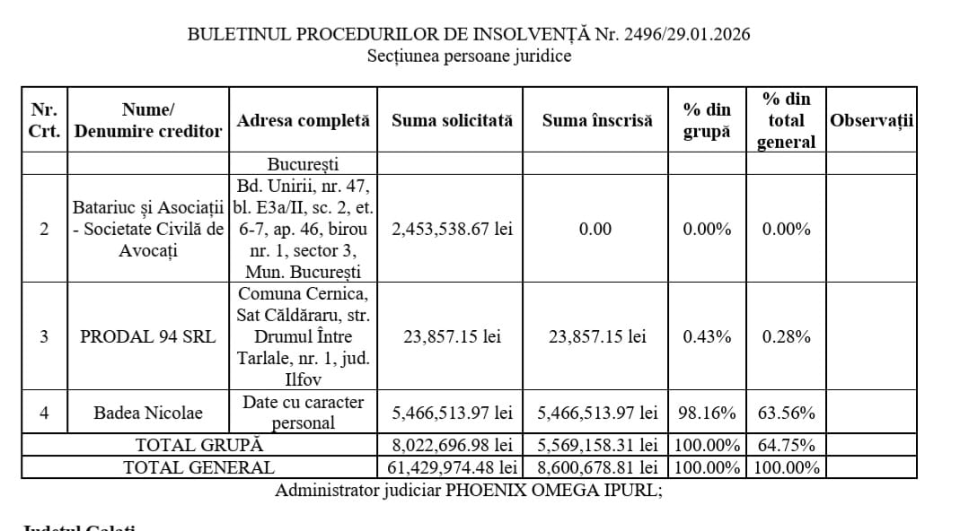 ProSport prezintă cine sunt aceștia și care sunt sumele totale înscrise, precum și cele acceptate de administratorul judiciar Phoenix Omega IPRL.