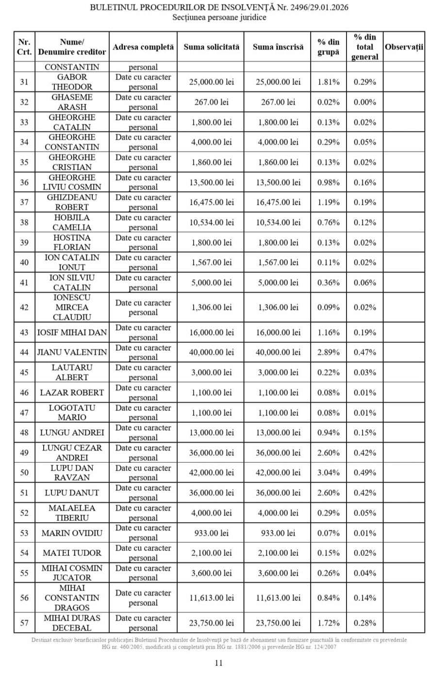 - Creditori chirografari – au solicitat 8,022,696.98 lei, iar sumele aprobate totalizează 5,569,158.31 lei.