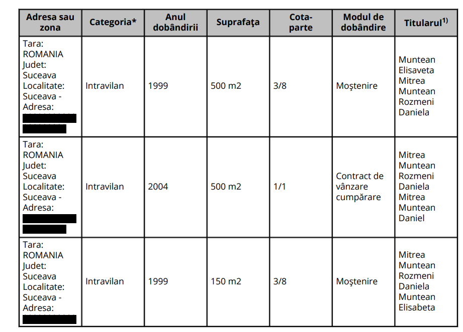 - 4 terenuri intravilane – 500 mp, 500 mp, 150 mp și 150 mp – dobândite în 1999 și 2004, prin moștenire sau tranzacție comercială;