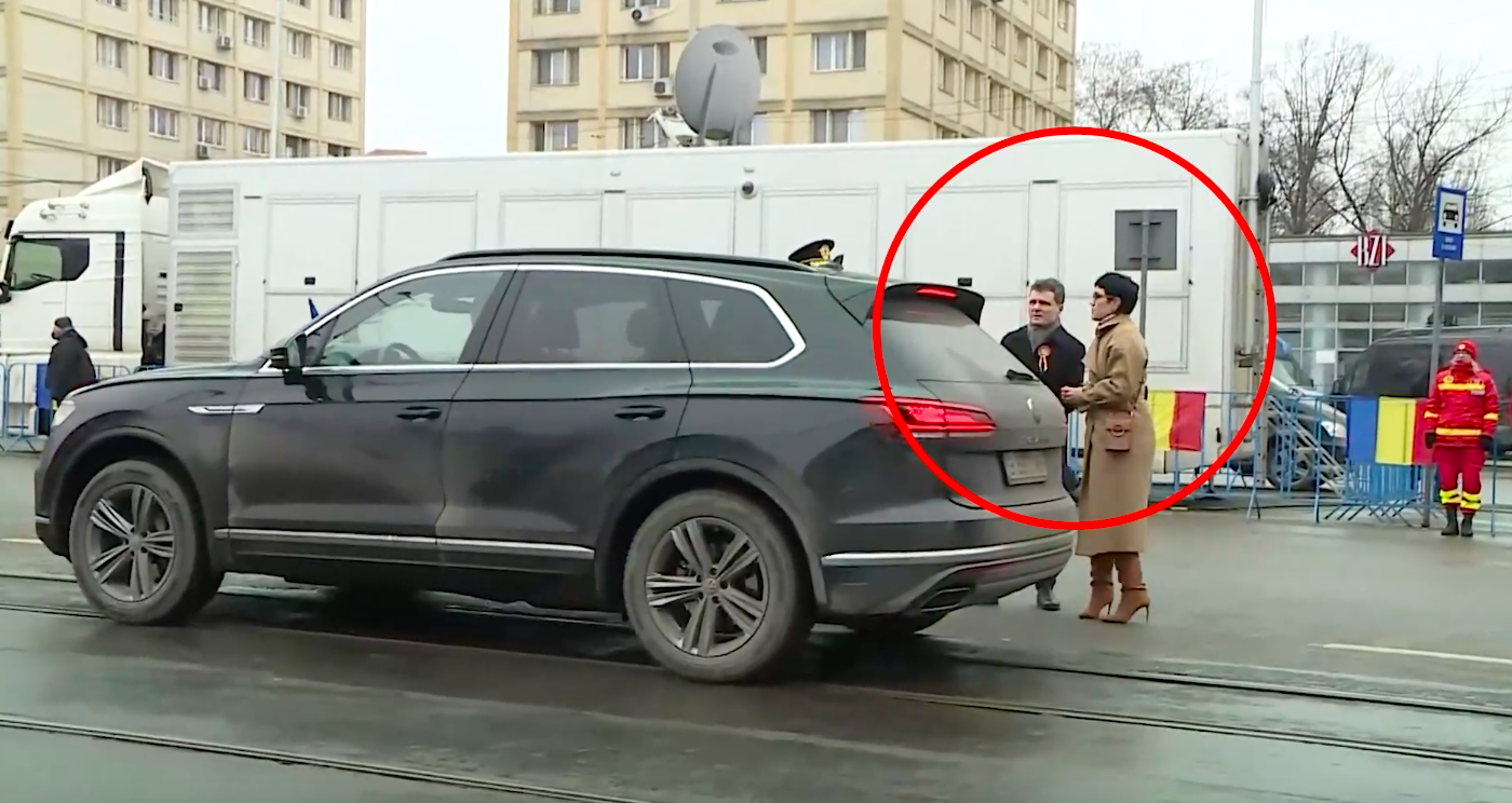 Președintele ascultă și își ajustează rapid mișcările conform indicațiilor, apoi pleacă în direcția indicată. Delia Dinu rămâne aproape pentru a se asigura că totul decurge conform protocolului și fără incidente, cum i se întâmplă frecvent lui Nicușor.