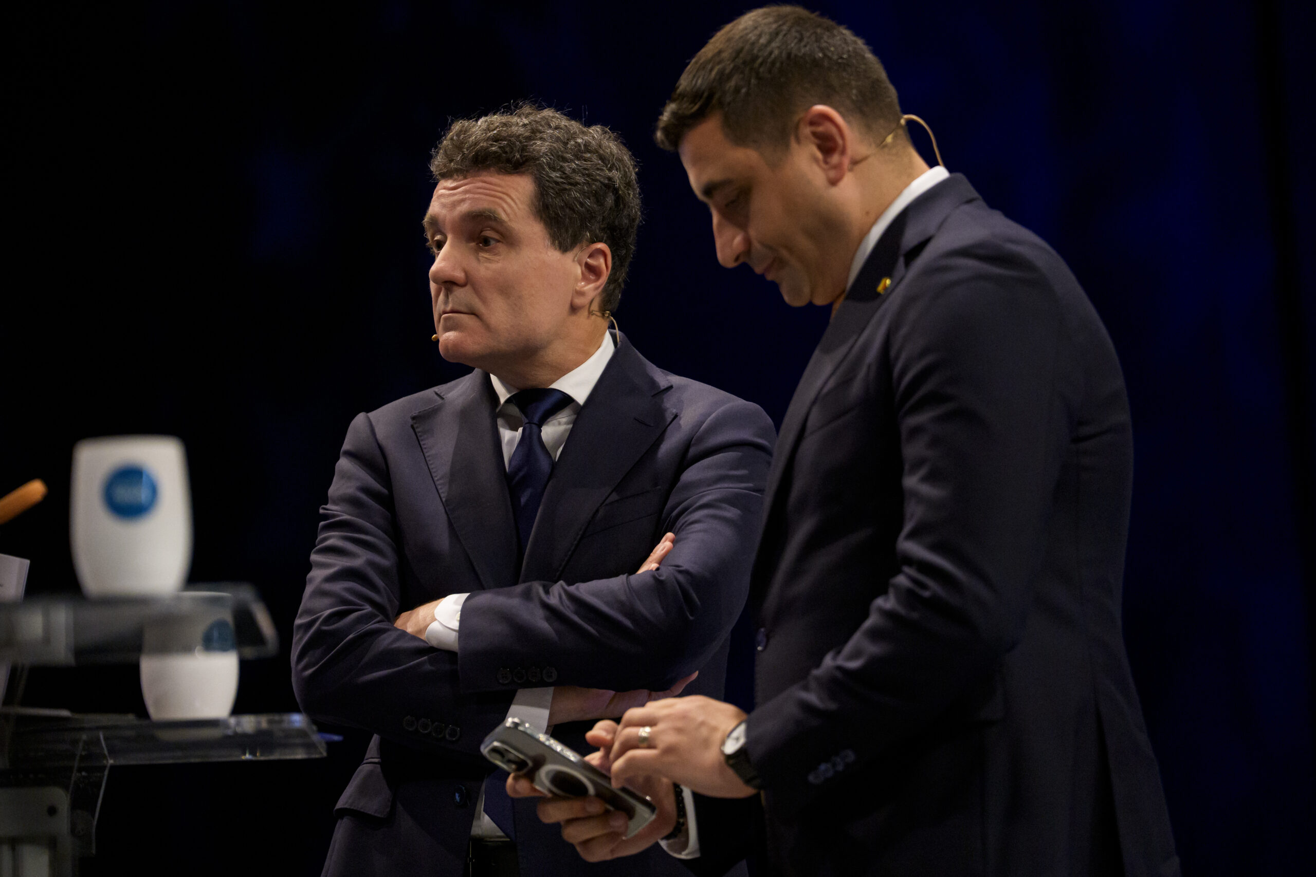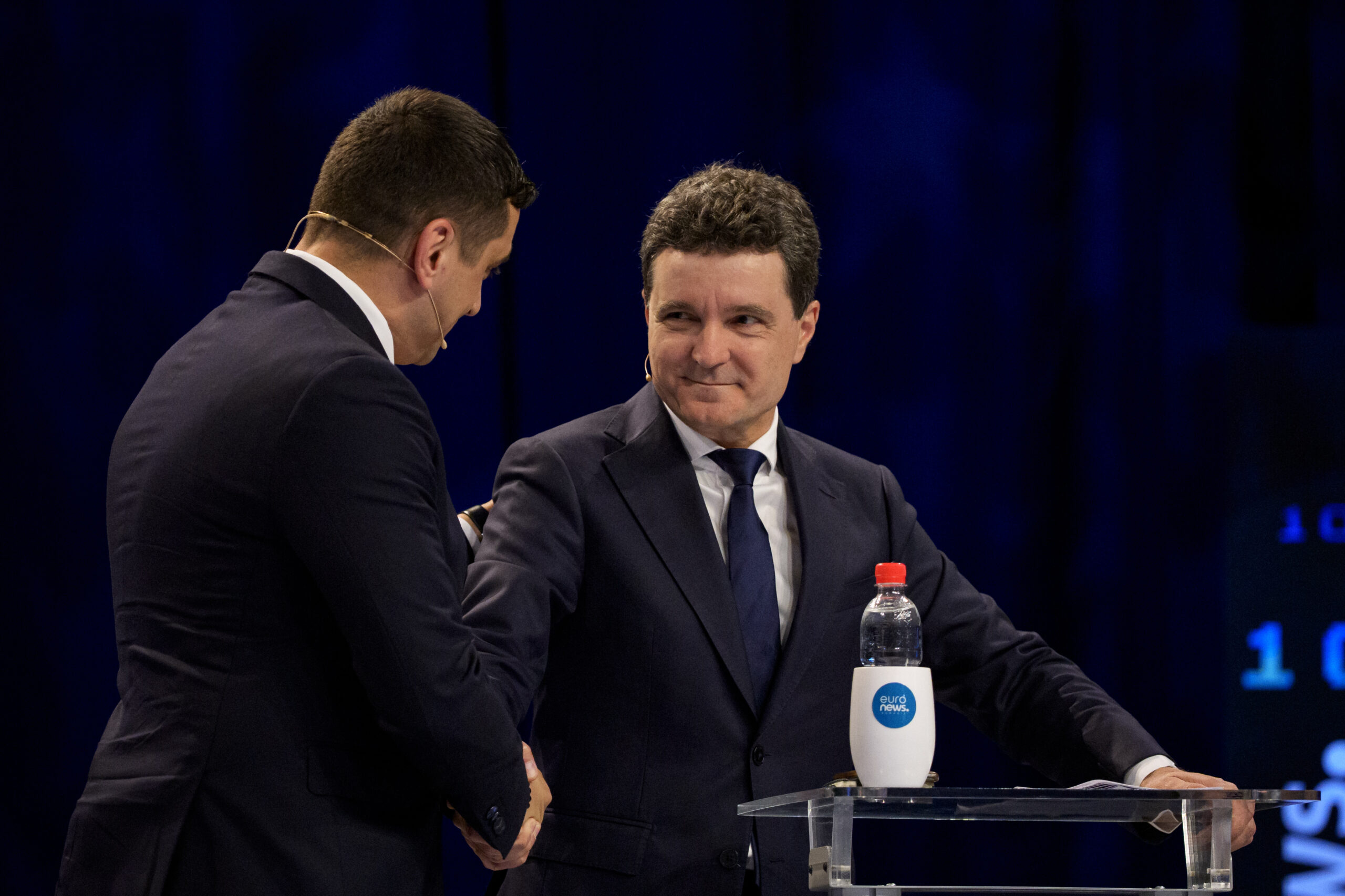 Candidatul independent Nicușor Dan și contracandidatul, George Simion, participă la o dezbatere electorală organizată de un post de televiziune, în București, joi, 8 mai 2025. ALEXANDRU ALEXANDRU / MEDIAFAX FOTO
