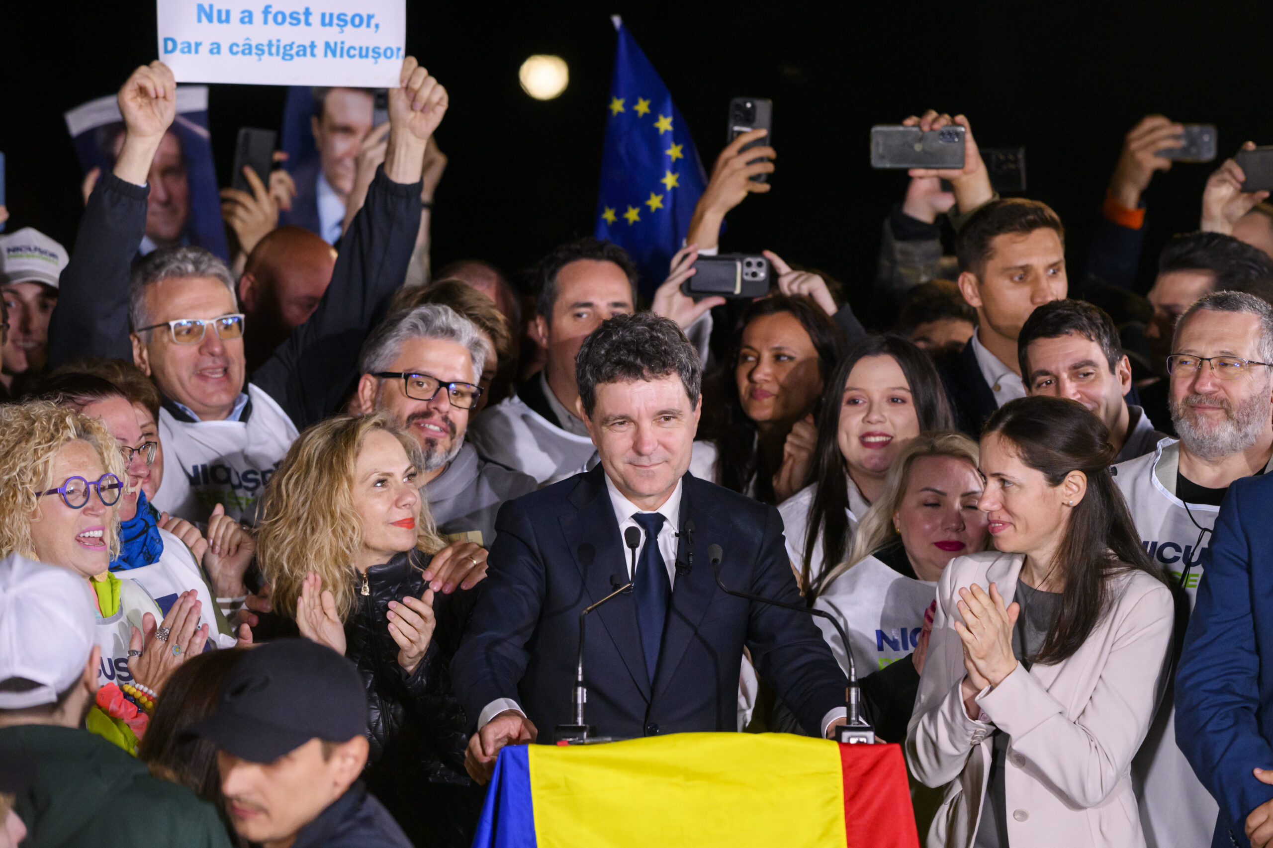 Candidatul independent Nicușor Dan sărbătorește succesul în turul al doilea al alegerilor, în București, luni, 19 mai 2025. ALEXANDRU DOBRE / MEDIAFAX FOTO.