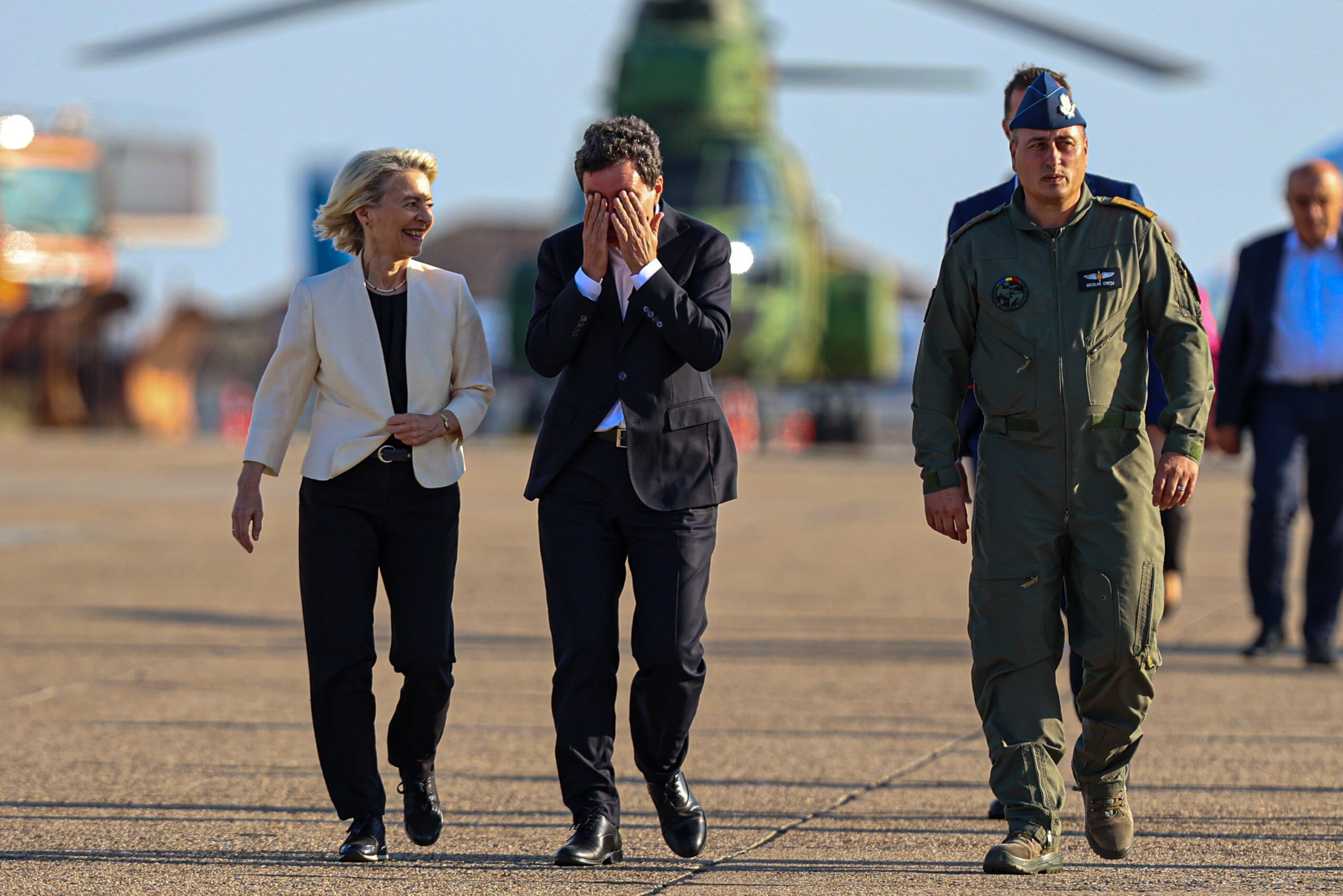 Președinta UE, Ursula von der Leyen, și președintele României, Nicușor Dan, discută în timp ce vizitează Baza 57 Aeriană, în Constanța, luni, 1 septembrie 2025. MIHAI POP / GMN / MEDIAFAX FOTO.