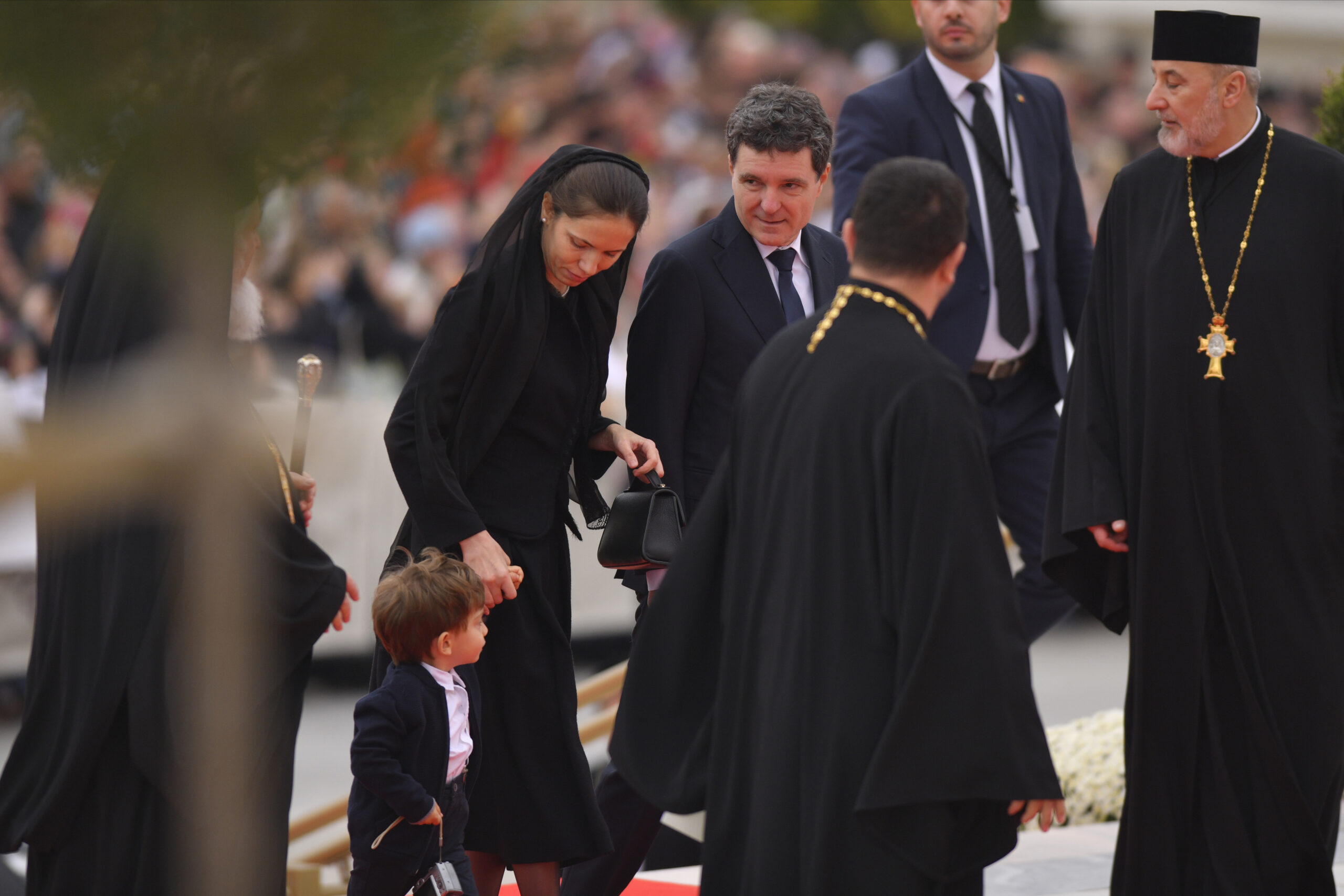 Nicușor Dan, împreună cu soția și fiul său, părăsește Catedrala Națională, după participarea la serviciul de sfințire a picturii, duminică, 26 octombrie 2025. ALEXANDRU DOBRE / MEDIAFAX FOTO.