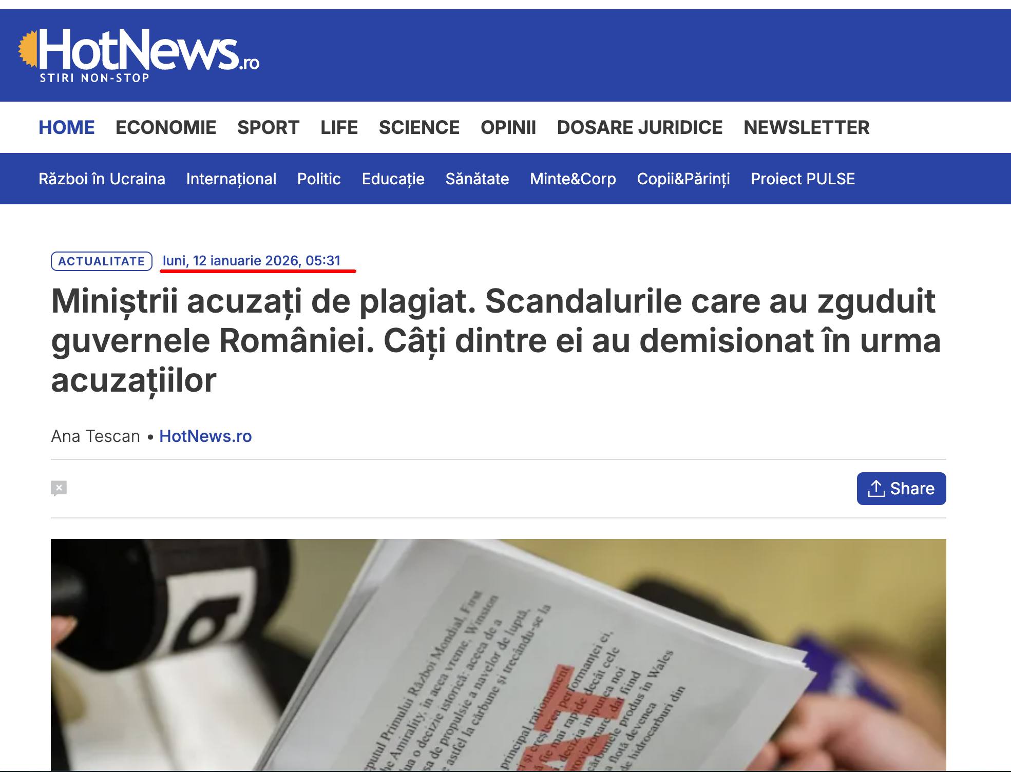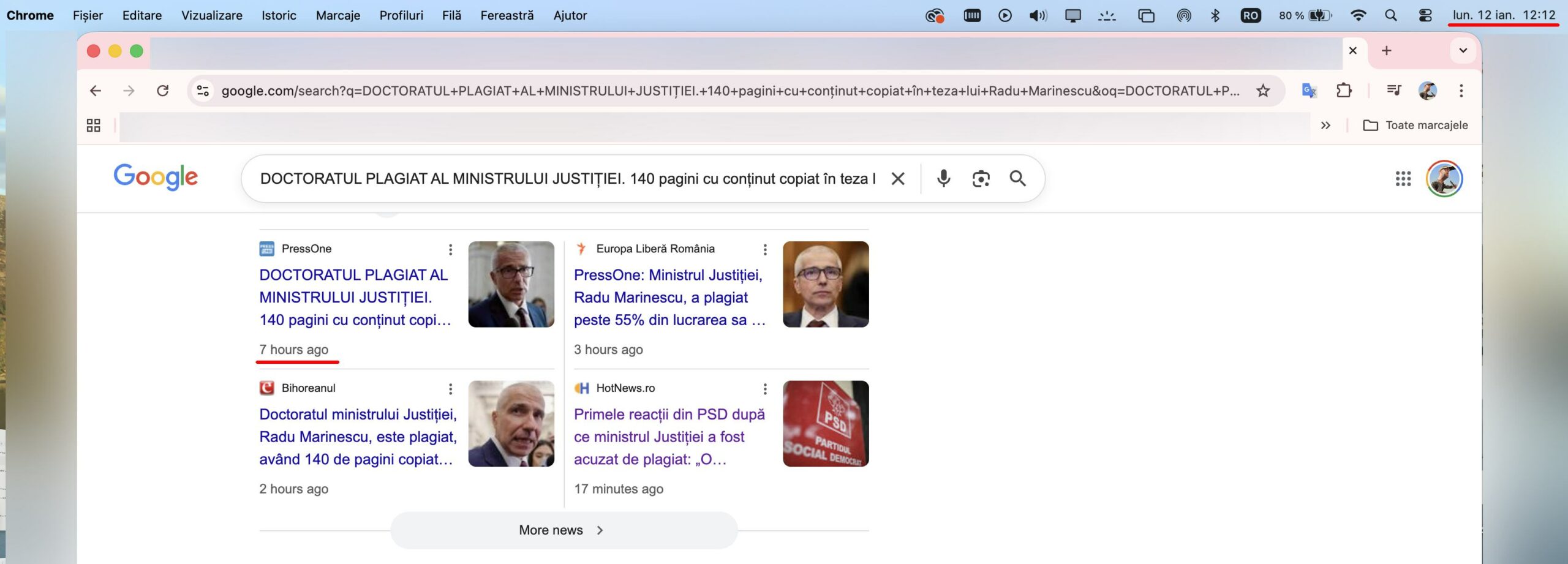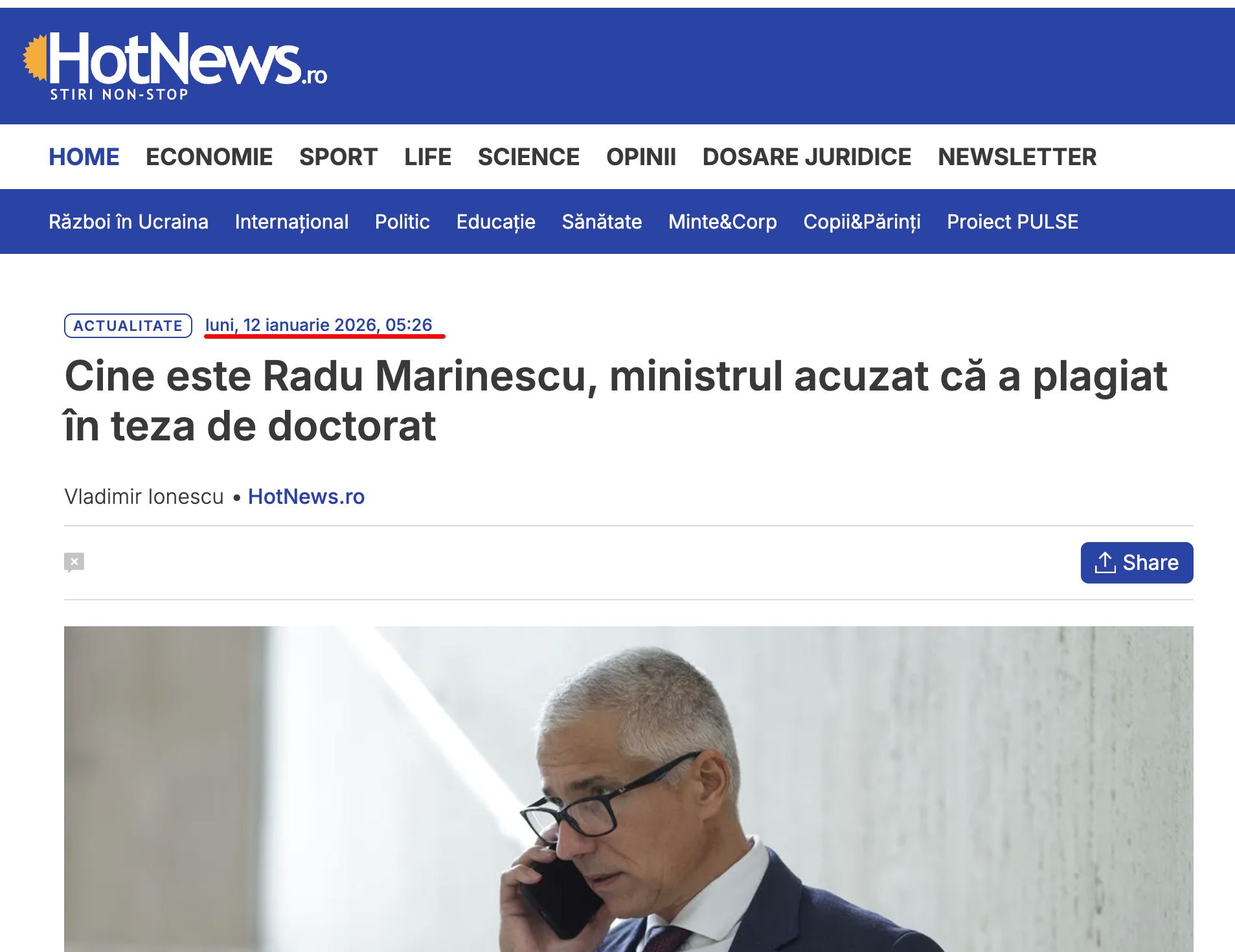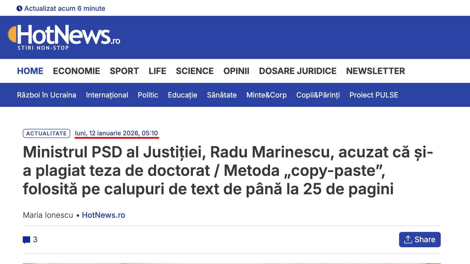 „PressOne a publicat la ora 5:00 dimineața (prima captură fiind realizată la ora 12:12, luni, 12 ianuarie, indicând faptul că articolul era deja indexat de Google cu șapte ore înainte, deci cel puțin la ora 5:12, dar mai probabil la 5:00) un material despre plagiatul grosolan al tezei de doctorat a lui Radu Marinescu, ministrul Justiției. Articolul integral poate fi citit aici: http://bit.ly/4pCVYwi.