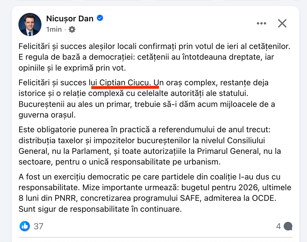Deși a trecut mai bine de o jumătate de zi de la anunțarea noului primar general al Capitalei, pe pagina sa de Facebook, Nicușor Dan a comis o greșeală de exprimare. I-a urat „felicitări și mult succes lui Ciptian Ciucu”, greșind denumirea liderului Partidului Național Liberal.
