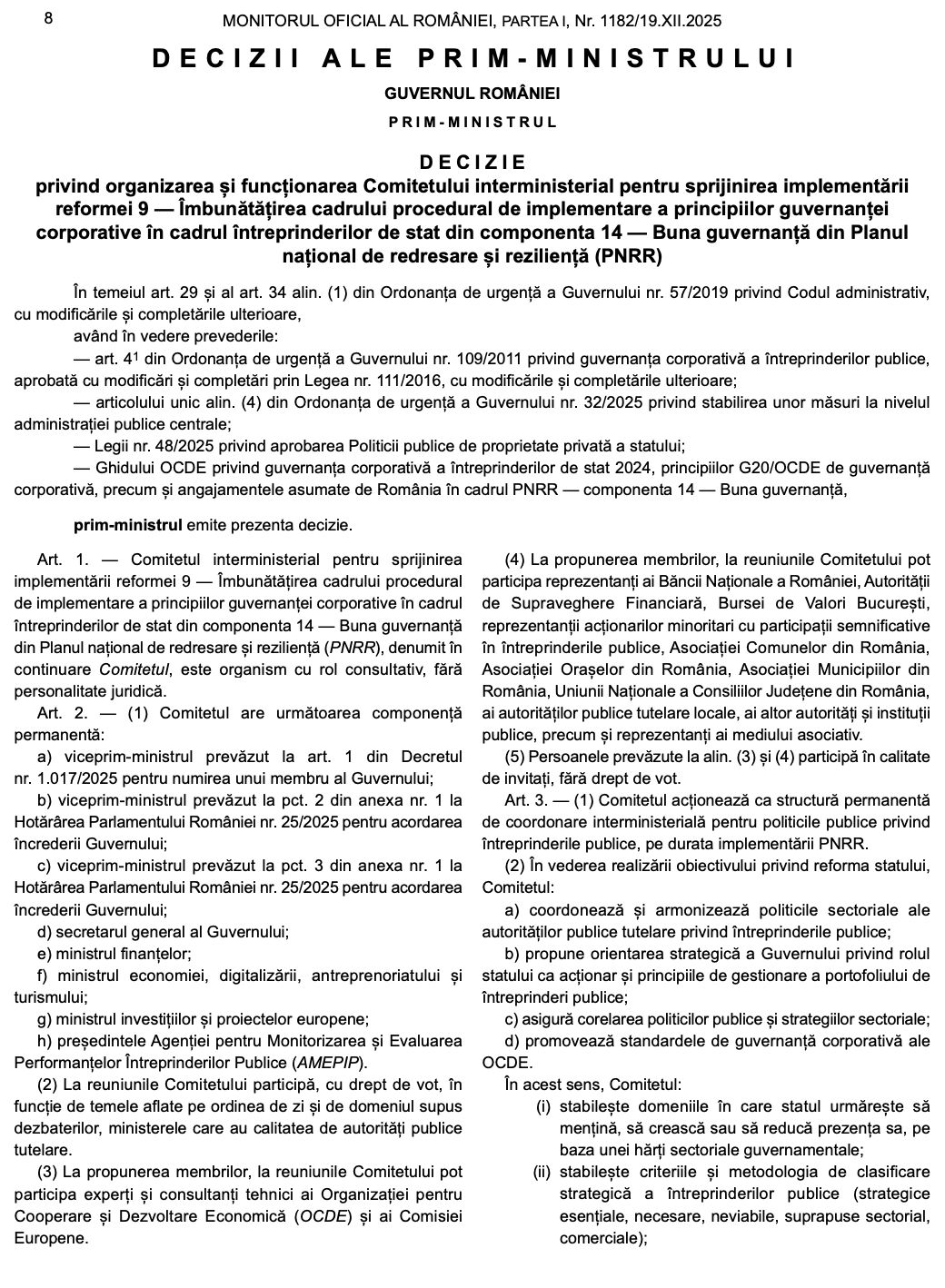 - Hotărâre privind organizarea și funcționarea Comitetului Interministerial pentru sprijinirea reformei 9 – Îmbunătățirea metodologiei de implementare a principiilor guvernanței corporative în cadrul companiilor de stat din componenta 14 – Buna guvernanță conform Planului Național de Redresare și Reziliență.