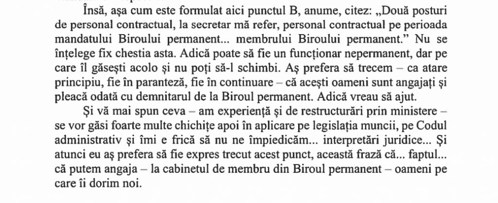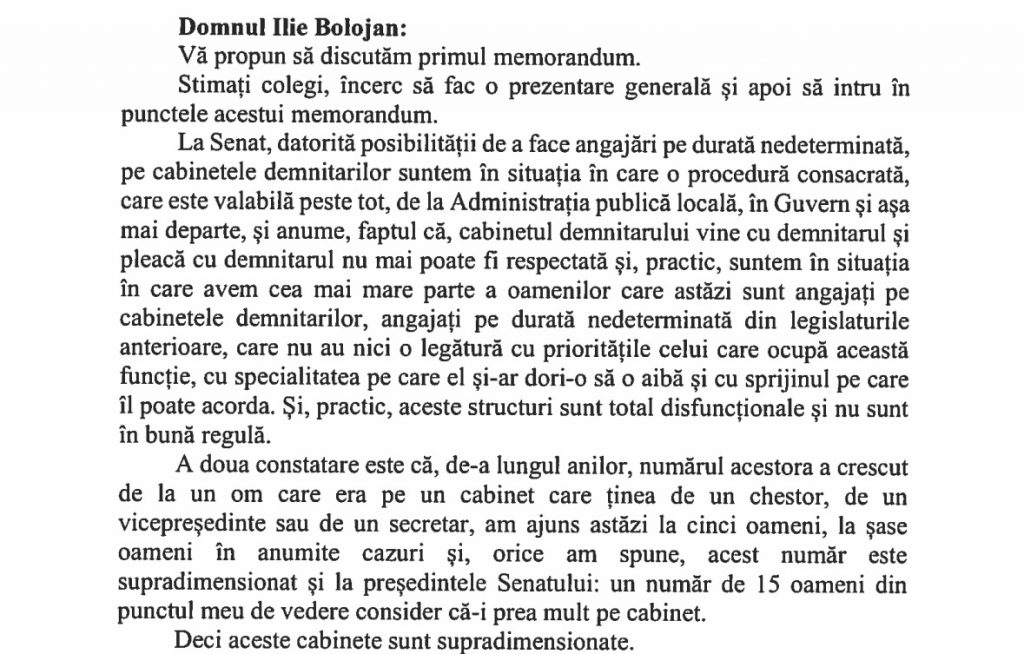 Două ore mai târziu, Ilie Bolojan a abordat frontal subiectul. Iar prima mare problemă a fost pusă direct pe masă: noii lideri de la Senat, cum este și el, nu-și pot angaja oamenii, pentru că pe durată nedeterminată erau deja posturile ocupate. Acesta a fost primul argument, înainte de a vorbi de numărul mare al angajaților. Argumentele lui Bolojan sunt scrise negru pe alb.