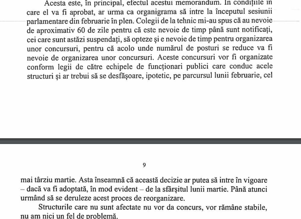 Discuțiile din 21 ianuarie au fost concretizate de adoptarea memorandumului luni, 3 februarie. Din numărul de posturi aferente echipei lui Ilie Bolojan ar urma să fie tăiate doar 5 posturi. Un paradox este, susțin surse politice, că la cum arată acum structura conducerii Senatului, Bolojan are în echipa sa trei directori și alți șase oameni. Așadar, jumătate sunt șefi. Și la Secretarul General are loc o mimare a reformei, spre deosebire de alte direcții și servicii. Adică sunt tăiate trei posturi, însă toate trei sunt vacante, potrivit informațiilor Libertatea.
