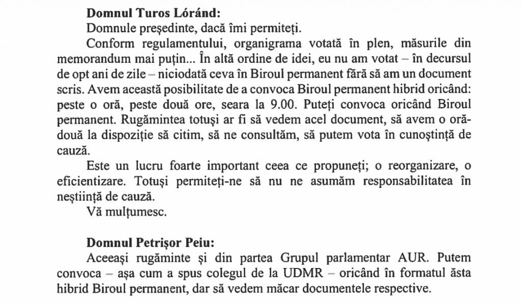 Sincopele au început încă din 21 ianuarie, la ora 13.00, când deși Ilie Bolojan a venit cu două memorandumuri pentru reducerea cheltuielilor bugetare (reorganizare a instituției, adică inclusiv concedieri, plus reducerea cotelor de carburant), o parte din aleșii din Biroul Permanent au ridicat prima problemă: votarea unui document neprezentat anterior. Conform stenogramei consultate de Libertatea, problema netrimiterii documentului a fost ridicată de Gheorghe Vela (lider de grup POT), Laurențiu Plăeșu (vicepreședinte al Senatului din partea AUR) și Novak Levente (chestor din partea UDMR).