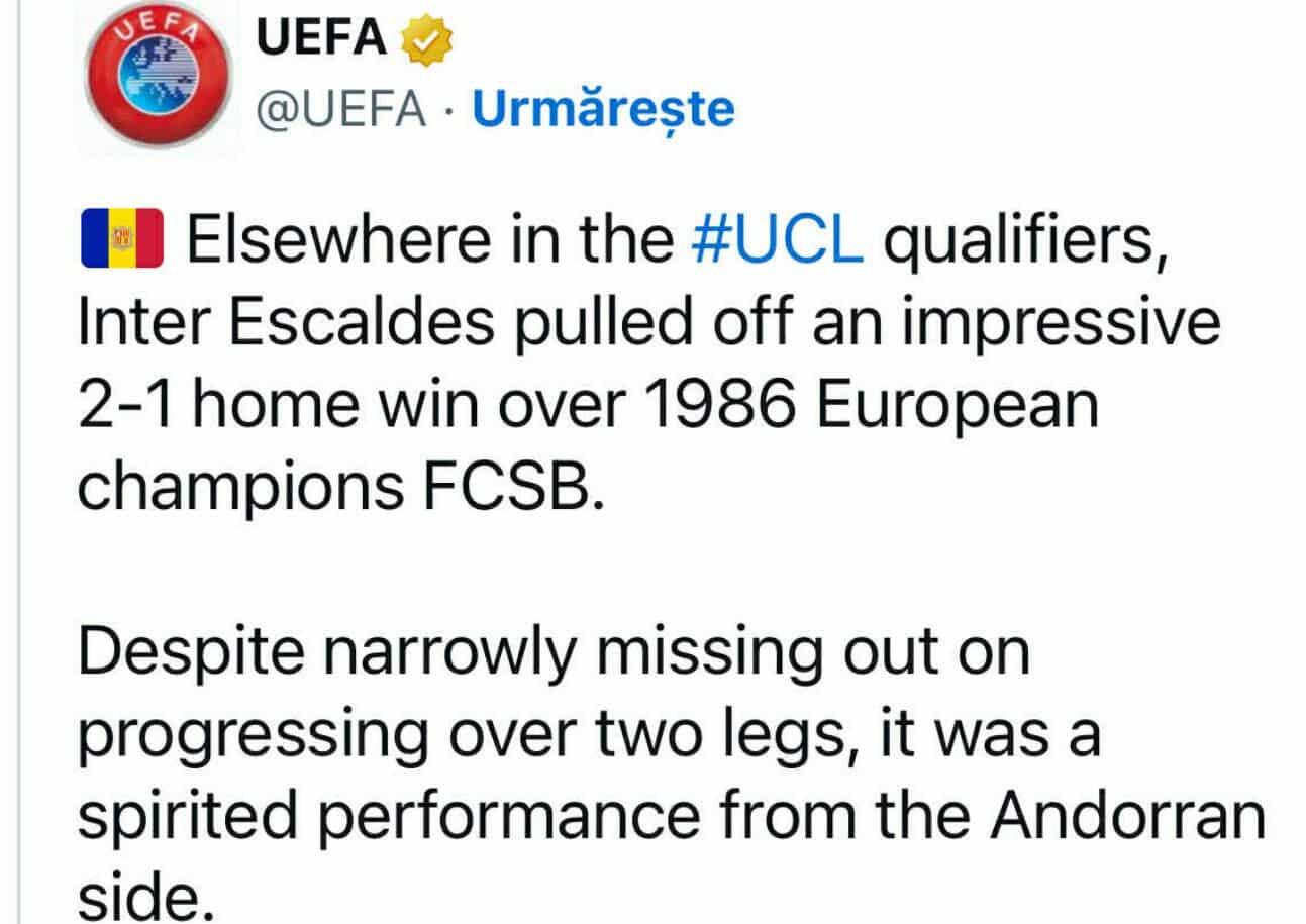 Este vorba despre o postare a UEFA pe contul său oficial, imediat după victoria lui FCSB împotriva lui Inter Escaldes, din prima fază preliminară a Ligii Campionilor, cu scorul general de 4-3.